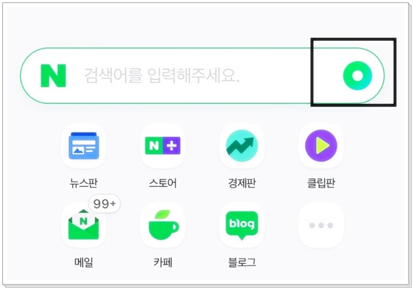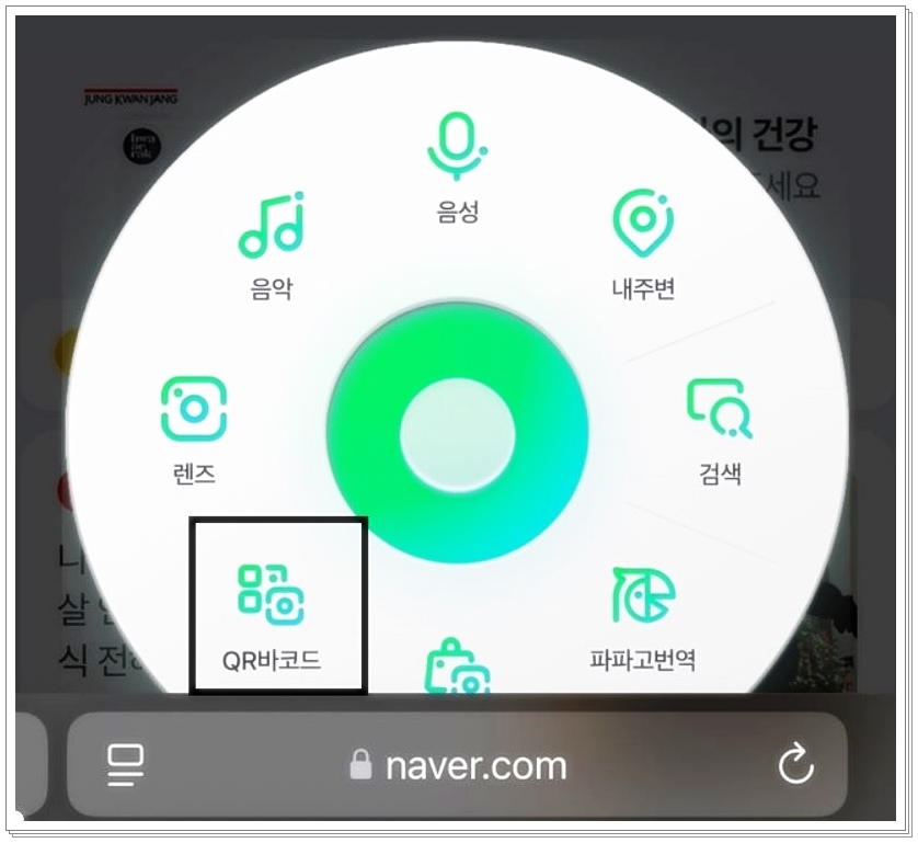 이 동그란 아이콘을 클릭하시면, 음성, 음악, 내 주변, 렌즈, 검색, 파파고 번역 등 다양한 옵션이 나타납니다. 이때, 큐알코드 부분을 클릭하시면 큐알코드를 스캔할 수 있는 기능이 활성화됩니다. 이렇게 간단하게 큐알코드를 스캔하실 수 있습니다. 정말 간편하죠?