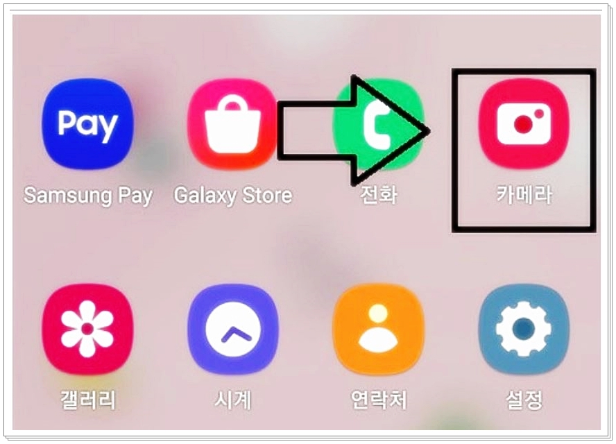 우선, 핸드폰을 켜고 QR 코드 스캔 기능을 활성화하면 됩니다. 참고로, 저는 갤럭시(안드로이드) 기기를 사용하고 있지만, 아이폰 사용자분들도 동일한 방법으로 진행할 수 있습니다. 핸드폰의 기본 카메라 앱을 실행하면 QR 코드 스캔 기능을 사용할 수 있으니, 먼저 메인 화면에서 카메라 아이콘을 찾아 클릭해 주세요.