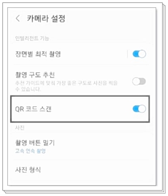 클릭하셨다면 아래와 같이 카메라 설정 화면이 나타날 것입니다. QR 코드 스캔 기능이 켜져 있어야 카메라를 QR 코드에 가져다 댔을 때 정상적으로 인식됩니다. 설정 화면에서 해당 옵션을 찾아 오른쪽으로 스위치를 이동시켜 활성화해 주세요. 스위치가 파란색으로 변하면 기능이 활성화된 것이니, 이 점도 참고해 주세요. 매우 간단하죠?