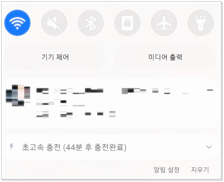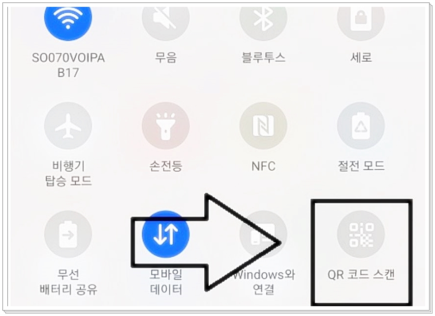 밑으로 내리시면 처음에는 기본 설정 화면만 보일 수 있는데요. 이때, 손가락으로 한 번 더 터치하여 아래로 더 쭉 내려주세요. 그러면 QR 코드 아이콘이 화면에 나타날 것입니다.
