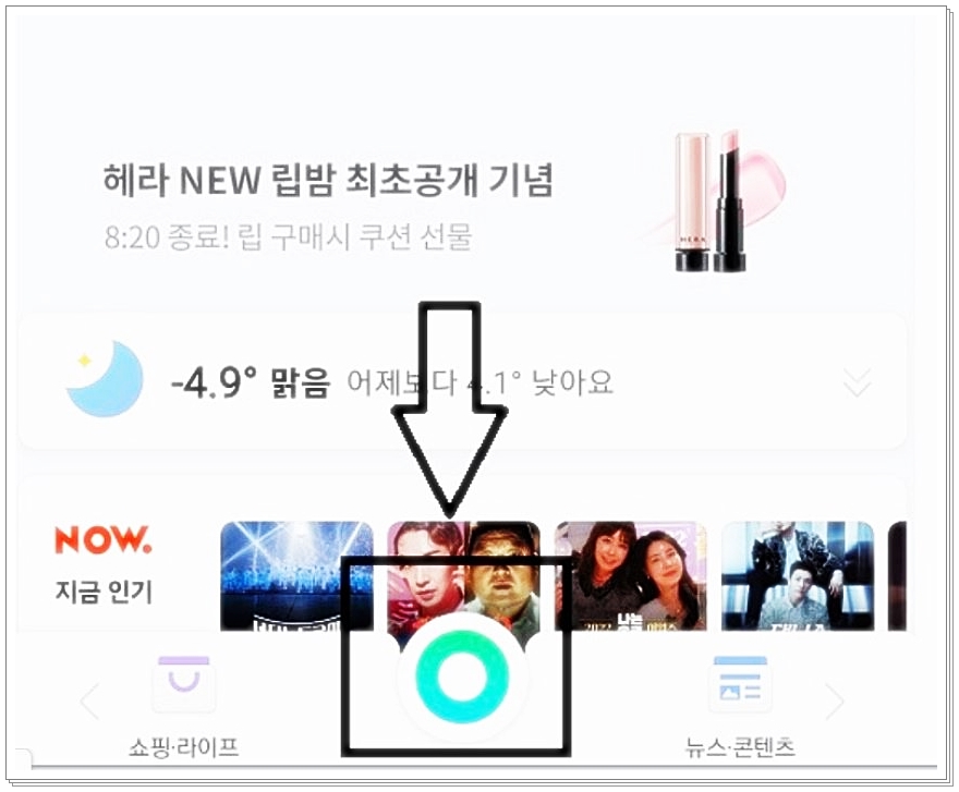 네이버 앱에 들어가셨나요? 이제 아래쪽에 위치한 동그라미 아이콘을 확인할 수 있을 것입니다. 이 아이콘을 클릭하면 QR 코드 스캔 기능에 접근할 수 있으니, 해당 아이콘을 눌러주세요.