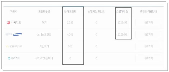 위에서 언급한 카드사가 총 11곳이라는 점, 꼭 확인해 주세요. 그런 다음 ‘카드 포인트 통합 조회’ 버튼을 클릭하시면 됩니다. 그러면 오른쪽에 잔여 포인트가 표시된 화면이 나타나는데요, 저도 직접 조회해보니 생각보다 많은 포인트가 쌓여 있어서 깜짝 놀랐습니다. 여러분은 저보다 더 많은 포인트를 가지고 계실 수도 있으니 꼭 확인해보시고요, 소멸 예정 월도 함께 표시되니 한 달에 한 번 정도는 꼭 체크하시는 걸 추천드립니다. 저는 3월에 소멸 예정인 포인트가 있었는데, 미리 확인해서 다행이었어요!
