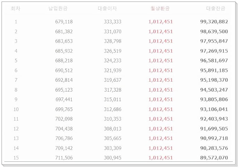 원금 + 이자 = 원리금 균등상환 (매월 동일한 금액 상환)