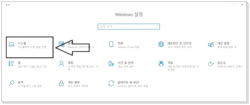 톱니바퀴를 클릭하게 되면 Windows 설정이 나오게 되는데요. 이때, 시스템을 클릭해 주세요. 시스템을 클릭하시게 되시면 디스플레이, 소리, 알림 및 작업, 집중 지원, 전원 및 절전, 배터리가 나오는데요.