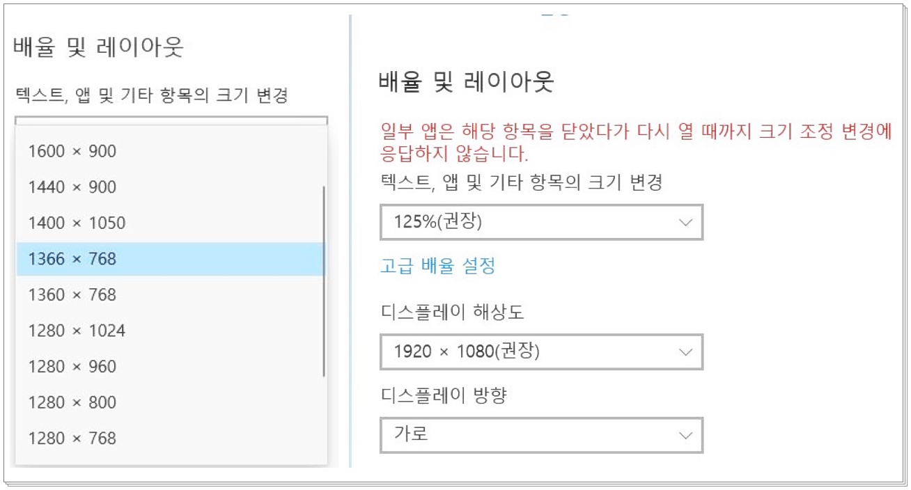 배율 및 레이아웃을 클릭하게 되면 많은 배율이 보이실건데요. 본인이 원하는 디스플레이 해상도를 설정하시면 됩니다. 저는 권장사항을 선택하여서 1360X768 에서 1920X1080 을 선택하였습니다.