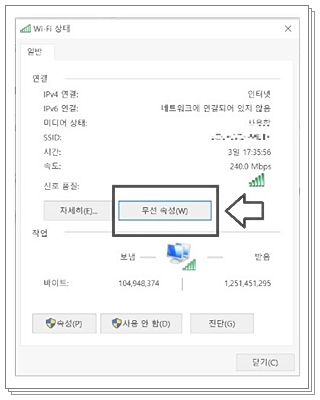 나의 주소를 클릭하셔서 들어가셨으면 무선 속성을 클릭하여 들어가주시면 되는데요. 들어가시게 되면 연결이 먼저 보이실 겁니다. 하지만 저희는 보안에 들어가서 나의 와이파이 비밀번호를 확인해야 하니 보안으로 들어가 주세요.