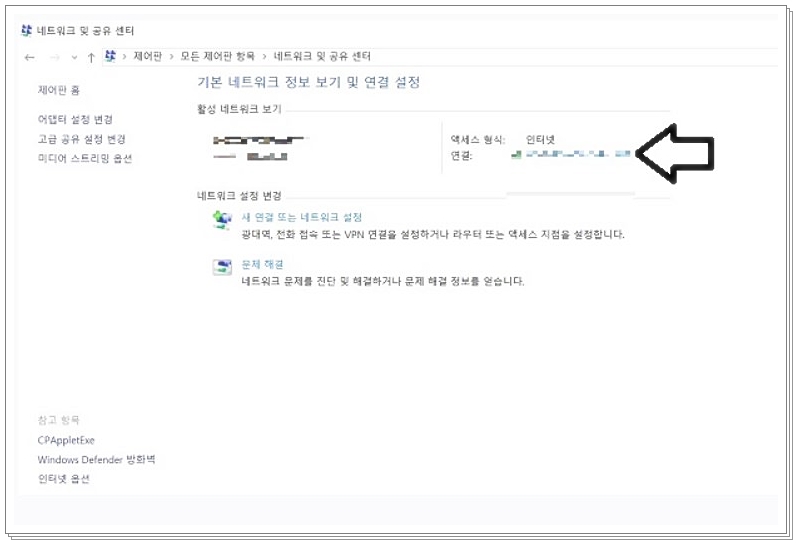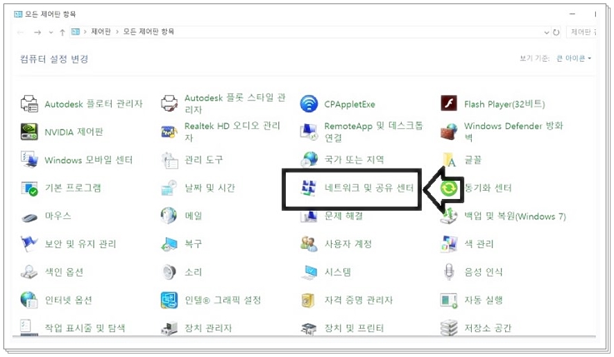 제어판을 키셨으면 수 많은 아이콘 중에서 네트워크 및 공유 센터에 들어가 줍니다. 네트워크 및 공유센터 로 들어가게 되면 나의 인터넷 주소를 볼수 있는데요. 파란색 나의 주소를 클릭하여 주세요.