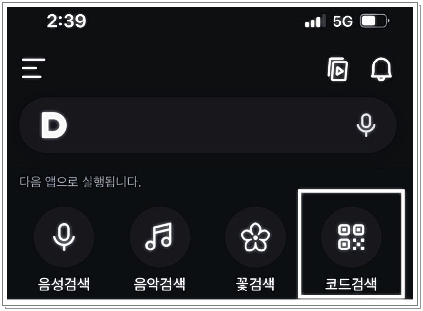마이크 모양을 클릭하셨다면, 아래와 같은 화면이 나타나게 됩니다. 이때 화면 하단 쪽을 보시면 ‘코드 검색’이라는 옵션이 보이실 텐데요, 해당 옵션을 눌러주신 뒤 QR 코드를 카메라에 비추기만 하면 됩니다. 정말 간단하고 직관적인 방식이라 누구나 쉽게 이용하실 수 있어요!