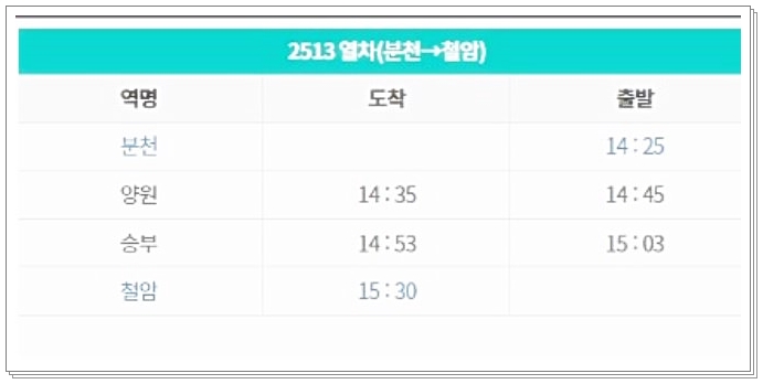 | 분천역 | 14:25 | 철암역 | 약 15:30 |
