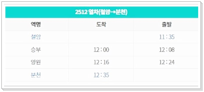 | 철암역 | 11:35 | 분천역 | 약 12:40 |