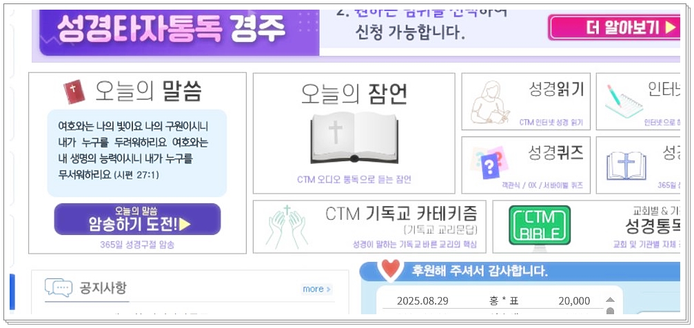 CTM 성경타자 통독은 성경 말씀을 직접 타자로 입력하며 통독과 타자 연습을 동시에 할 수 있도록 개발된 온라인 서비스입니다. 기독교 교육 및 콘텐츠 전문기관인 CTM(Christian Teaching Ministry)에서 운영하며, 성경 전체를 개역개정 또는 개역한글 버전으로 타이핑할 수 있도록 구성되어 있습니다. 특별한 설치 없이 웹사이트에 접속해 바로 이용할 수 있으며, 사용자는 말씀을 따라 타자하면서 오타 없이 정확하게 입력하는 습관과 함께 말씀을 집중해서 읽는 훈련을 할 수 있습니다. 이 서비스는 신앙 훈련, 주일학교 숙제, 말씀 암송, 타자 연습 등 다양한 목적으로 활용 가능하며, 무료로 제공된다는 점에서 많은 이들이 꾸준히 이용하고 있습니다.