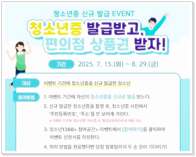최근 지자체, 여성가족부, 청소년활동진흥센터에서는 청소년증 발급을 독려하기 위해 편의점 모바일 상품권 증정 이벤트를 진행하고 있습니다.