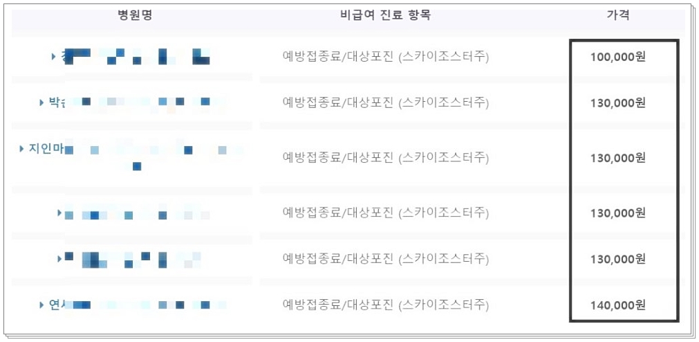 - SK바이오사이언스 스카이조스터: 14만 원, 주로 50세 이상 접종, 예방 효과 약 60%