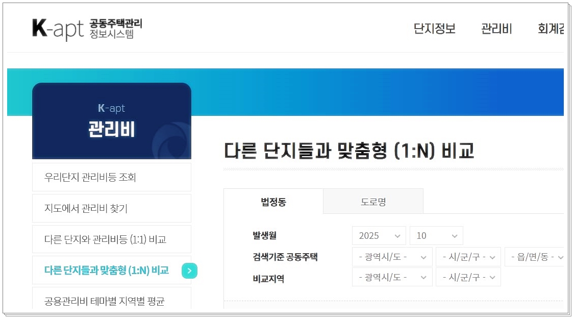 K-APT는 유사한 규모나 지역의 다른 단지와 관리비 비교 통계 기능을 제공합니다.