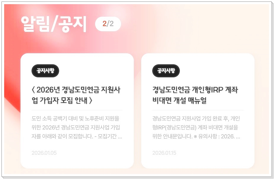 경남도민연금은 매년 정해진 모집 기간 동안 신청을 받으며, 2026년의 경우 1월 19일~2월 22일 사이에 접수가 이루어졌습니다(소득 구간별로 순차 접수) . 신청 전에는 본인의 자격 요건(연령·소득·거주지·IRP개설 가능 여부)를 먼저 확인해 두는 것이 중요합니다 .